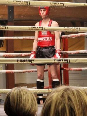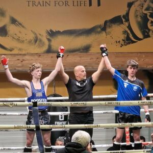 William Balaes, Coin rouge, 63.5 Kg 15 ans combattait Noa Medhurt Coin bleu 62,5 Kg 15 ans